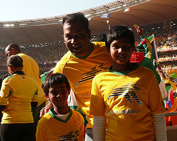 Die Augen leuchten. Drei Augenpaare unter 86000 Zuschauern im Soccer-City Stadion in Johannesburg. Balan Ramsamy und sein achtjähriger Sohn Kiam sowie der zwei Jahre jüngere Bruder Sayi tragen natürlich die gelben Trikots ihres Heimatlandes. "Bafana, Bafana", schallt es durch das Stadion. Der Lärm ist ohrenbetäubend. Die Vuvuzelas, die afrikanischen Trompeten, leisten ganze Arbeit. Und trotzdem oder gerade deswegen ist dieser Moment etwas Besonderes für Balan Ramsamy und seine beiden Söhne. Denn der Manager einer Firma, die orthopädische und medizintechnische Produkte herstellt, hat sonst wenig Zeit für seine Söhne, denn er ist viel unterwegs. Doch die Leidenschaft für Fußball haben sie alle gemeinsam. "Zuhause ist Fußball das einzige Thema zwischen uns dreien. Meine Frau ist schon ganz verrückt", erläutert Balan Ramsamy. Drei Herzen schlagen gemeinsam einen Takt. Fußball ist ihr ein und alles. Es ist Eröffnungsspiel bei der Fußball-Weltmeisterschaft. Südafrika gegen Mexiko.